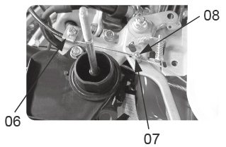 把油門開關向前推到底是怠速位置。取下空氣濾芯器,從壓板(右圖06位)下面穿過油門線管并鎖緊壓板(右圖06位),壓住油門線套管,拉出油門鋼絲連接到發動機油門支架上(右圖07位)鎖緊螺栓(右圖08位),要保持油門開關自然回位。重新安裝上空氣濾的蓋子。